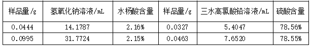 第一步:用氫氧化鈉溶液滴定樣品,測試磺基水楊酸和硫酸消耗的總堿量;第二步:用高氯酸鉛標準溶液測試樣品中硫酸的量,計算出硫酸含量;第三步:計算硫酸所消耗的堿量,總堿量減去硫酸消耗的堿量,得出水楊酸消耗的堿量,計算出水楊酸含量。